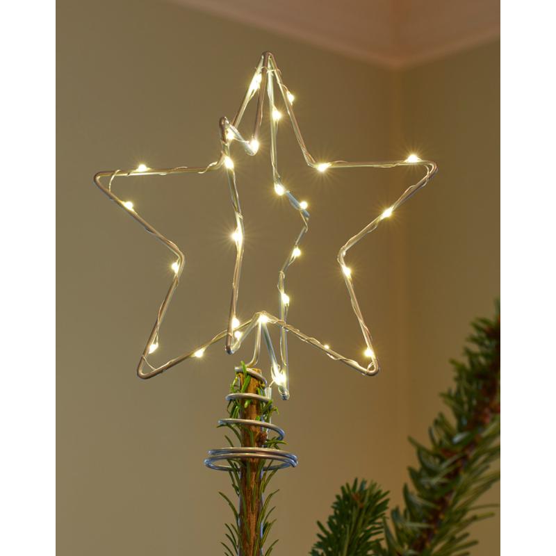 Sommet d’arbre en forme d’étoile 3D argentée avec 30 LED blanc chaud. Élégante et intemporelle, parfaite pour couronner le sapin avec une lumière douce. Fonctionne à piles et compatible télécommande Sirius.